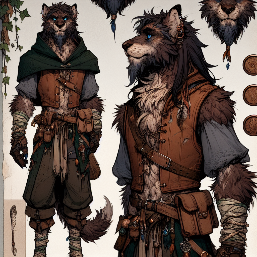 Brinogar stands tall at 6' 1", with a lean, muscular build typical of a seasoned ranger. His fur is a deep mahogany brown, with a lighter underbelly, and is adorned with small streaks of gray around his scruffy beard that adds a rugged charm to his visage. His keen blue eyes gleam with mischief and cunning, framed by thick, expressive eyebrows. He wears a multitude of layers typical of rogue rangers—a scratched leather vest cinched by a belt festooned with pouches and throwing daggers. Brown leather trousers, tattered at the edges, and sturdy, scuffed boots protect his legs. A dark green cloak billows around him, featuring subtle patterns that mimic leaf veins. Small wooden trinkets dangle from his belt, each holding a story. His pride lies in his elaborate, braided scruffy beard, which flows down to his chest, adorned with feathers and small wooden beads, distinguishing him from ordinary rangers.