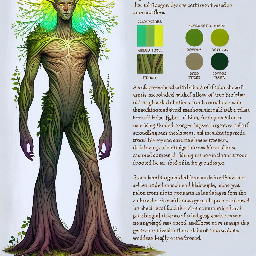 Mungo stands tall at 6' 2", with a sinewy, bark-like skin resembling the deep grooves of a baobab tree. His arms are elongated and branch-like, adorned with vibrant green leaves that sprout from his elbows and shoulders. His face, an intricate blend of humanoid and plant features, boasts vibrant yellow eyes that glimmer with ancient wisdom and a mischievous grin. Mungo's hair emerges in thick tendrils that resemble vines, cascading down his back in a medley of colors that shift from deep emerald to bright lime. Dressed in a flowing robe woven from the fibers of the luminescent Quoros plant, its colors undulate from soft teal to pastel pink, Mungo exudes an ethereal charm. His feet are wide and flat, mimicking tree roots, anchoring him firmly to the ground, as if he draws strength from the planet beneath him. He carries a satchel made from weaved moss and wildflowers, ready to distribute nature’s secrets as he roams.