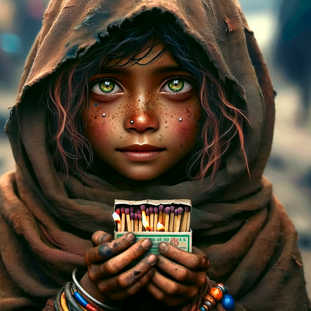 Elara Flickerwood is a petite girl with a lithe frame, standing at 4' 9". She's adorned with a tattered brown cloak that wraps around her shoulders, the hood often shadowing her bright, inquisitive green eyes. Her hair is a multitude of messy golden curls, framing her face like a halo of sunshine. Freckles dance across her nose and cheeks, a testament to her frequent time spent outdoors, while her hands are often marked with soot from the countless fire-lit matches she sells. Elara's feet are bare, bearing the scars of her youthful journeys through the bustling streets where she sells her wares. Each box of matches she carries is adorned with a small, hand-painted design of a flickering flame, giving them a touch of whimsy. On her left wrist, she wears a tarnished silver bracelet threaded with colorful beads, each telling a story from her life's journey.