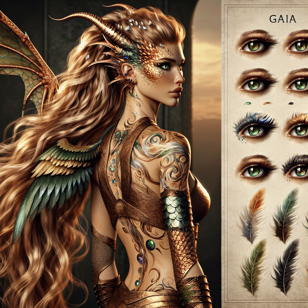 Gaia stands tall and prominently athletic, her skin the warm hue of sunlit bronze. She has long, flowing hair that shimmers like molten gold cascading down her back. Her eyes are reminiscent of emeralds, burning with passion and purpose. Along the sides of her face, small scales, reminiscent of her dragon ancestry, glint in the light, adding an exotic charm. She wears intricate armor forged from enchanted dragon scale and steel, offering protection while showcasing the grace of her movements. Adorning her shoulders are natural, feathery wings made from the iridescent quills of a mighty beast, clutched tightly against her back. Her powerful forearms are marked by varied tattoos that signify her victories in battle, each symbol telling a story of bravery and valor.